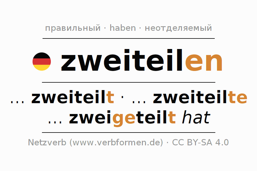 - Презенс: zweiteil(e) (du), zweiteilen wir, zweiteilt (ihr), zweiteilen Sie