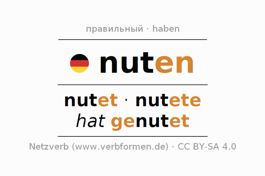Глагол 'nuten' онлайн как таблица глаголов со всеми наглядно представленными формами. Значение глагола nuten таким образом является помощью для выполнения домашних заданий; подготовки к экзаменам и контрольным работам, а также к урокам немецкого языка; для обучения в вузах и при получении образования для взрослых. Именно для изучающих немецкий язык – правильное спряжение глаголов (nutet - nutete - hat genutet) является решающим фактором.