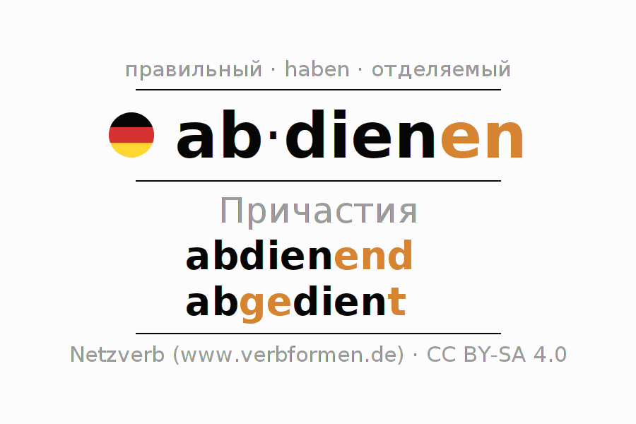 Формами причастия abdienen (отслужить, выслуживать) являются: {PARTIZIP 1}, {PARTIZIP 2}