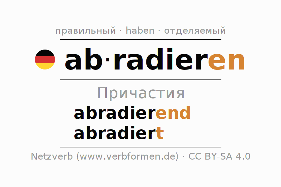 Формами причастия abradieren (соскоблить, стереть) являются: {PARTIZIP 1}, {PARTIZIP 2}