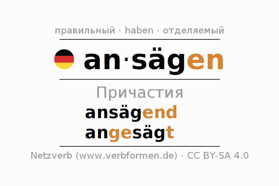 Формами причастия ansägen (врезаться, надпиливать) являются: {PARTIZIP 1}, {PARTIZIP 2}