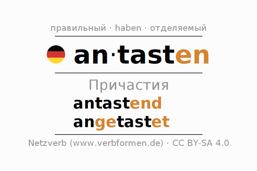 Формами причастия antasten (посягать, нарушать) являются: {PARTIZIP 1}, {PARTIZIP 2}