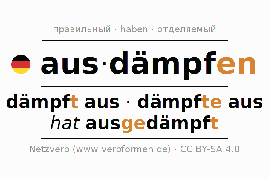 Формами причастия ausdämpfen (выпаривать, выпарить) являются: {PARTIZIP 1}, {PARTIZIP 2}