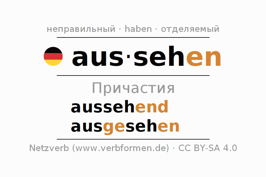 Формами причастия aussehen (выглядеть, казаться) являются: {PARTIZIP 1}, {PARTIZIP 2}