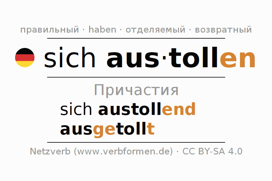 Этот глагол sich austollen полностью спрягается во всех лицах и числах Партицип Презенс Перфект.