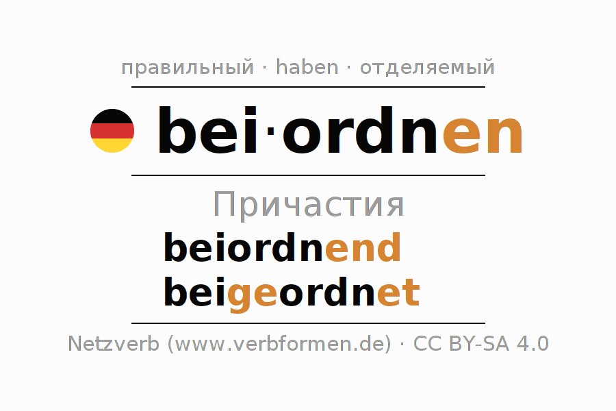 Формами причастия beiordnen (поддержка, помощь) являются: {PARTIZIP 1}, {PARTIZIP 2}