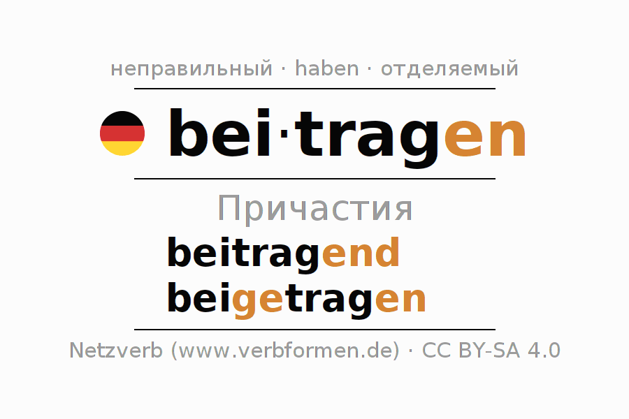 Формами причастия beitragen (содействовать, вносить) являются: {PARTIZIP 1}, {PARTIZIP 2}