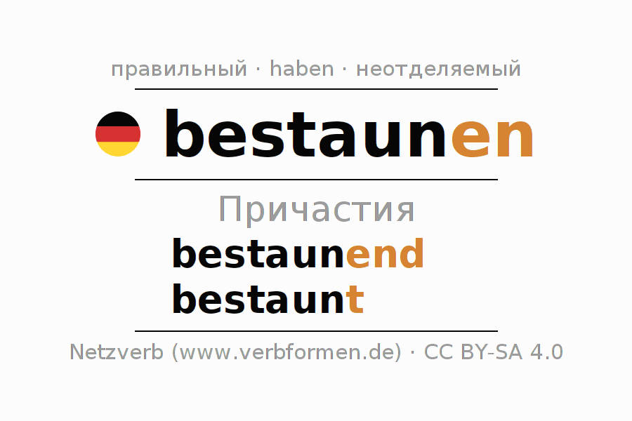 Формами причастия bestaunen (удивляться, восхищаться) являются: {PARTIZIP 1}, {PARTIZIP 2}