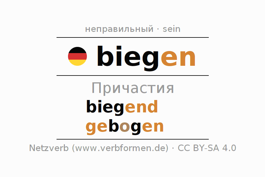 Формами причастия biegen (изгибать, изогнуть) являются: {PARTIZIP 1}, {PARTIZIP 2}