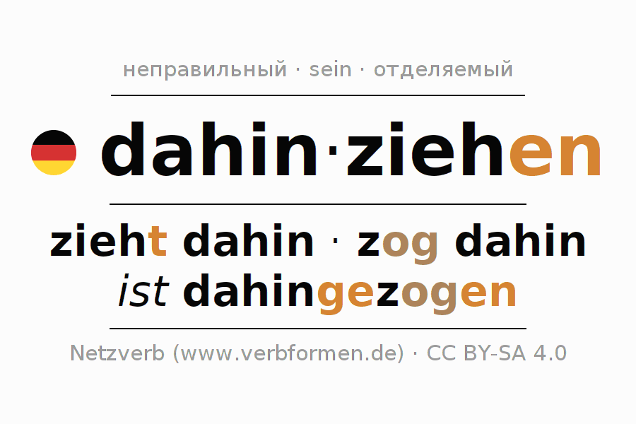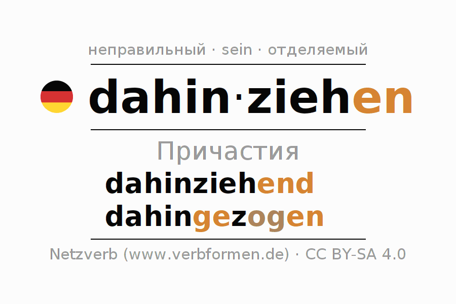 Формами причастия dahinziehen (тянуться, двигаться вперёд) являются: {PARTIZIP 1}, {PARTIZIP 2}