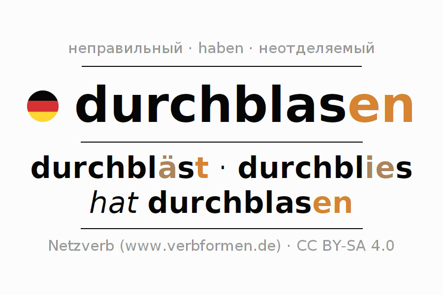 Формами причастия durchblasen (продувание, продувать) являются: {PARTIZIP 1}, {PARTIZIP 2}