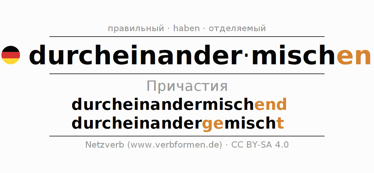 Формами причастия durcheinandermischen (перемешивать, смешивать) являются: {PARTIZIP 1}, {PARTIZIP 2}