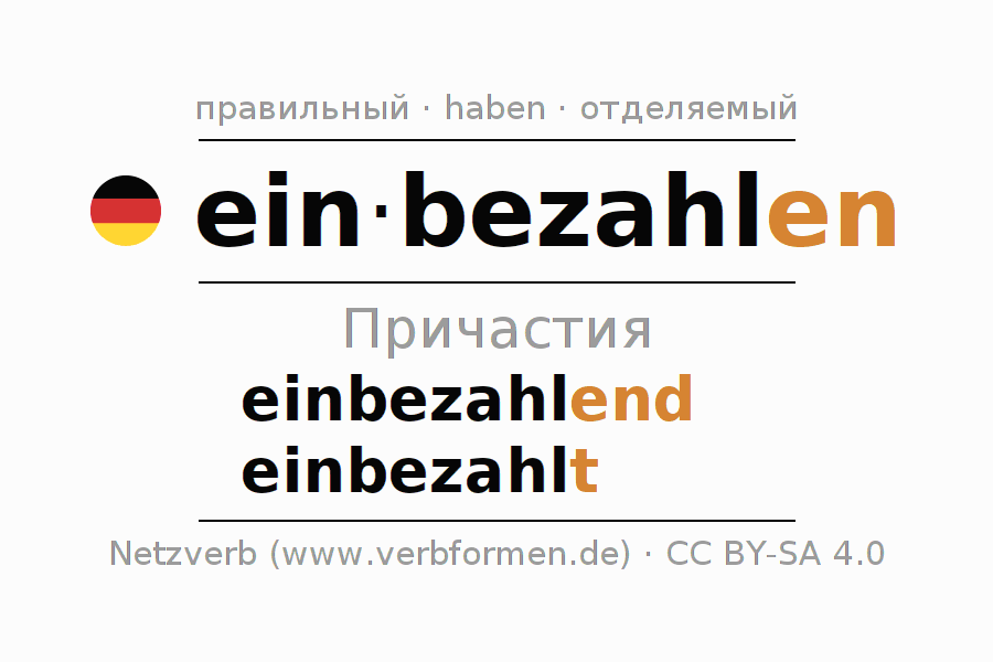 Формами причастия einbezahlen (вносить, депозит) являются: {PARTIZIP 1}, {PARTIZIP 2}