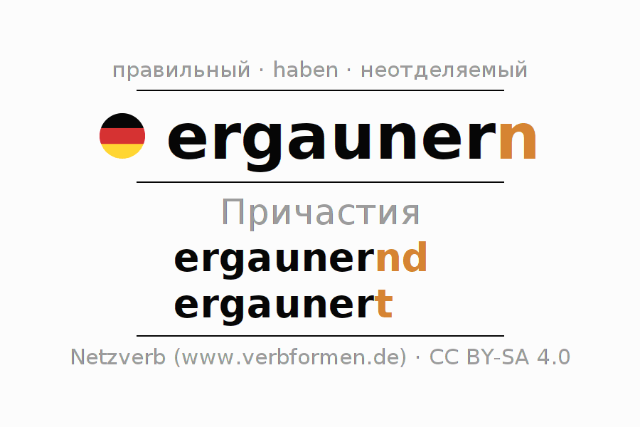 Формами причастия ergaunern (выуживать, мошенничеством) являются: {PARTIZIP 1}, {PARTIZIP 2}