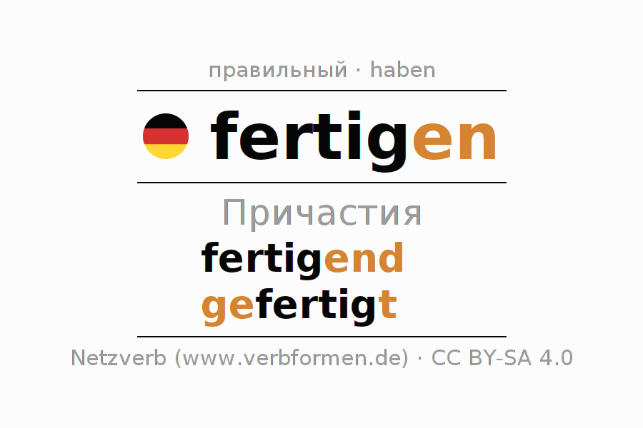 Формами причастия fertigen (изготавливать, изготовлять) являются: {PARTIZIP 1}, {PARTIZIP 2}