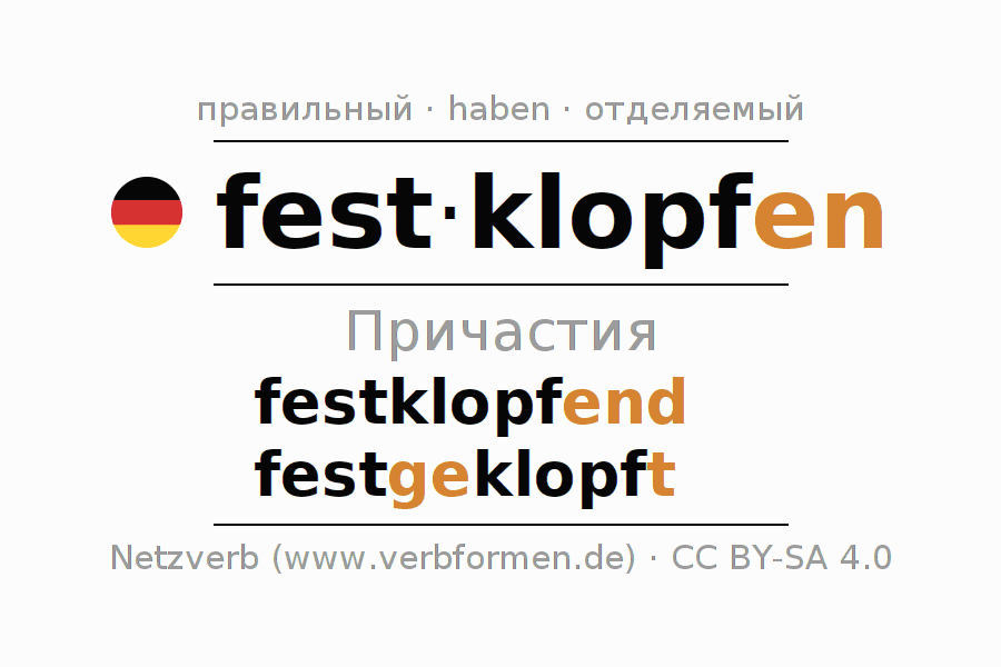 Формами причастия festklopfen (закрепить, согласовать) являются: {PARTIZIP 1}, {PARTIZIP 2}