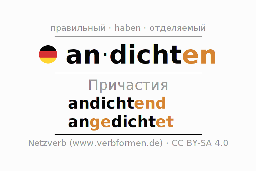 Спряжение andichten в Партицип Презенс Перфект часть речи Действительный залог (актив): andichtend, angedichtet.Образование этих форм происходит по определённым грамматическим правилам. Так же спрягаются простые глагольные формы andichten в Партицип. Kомментарии ☆
