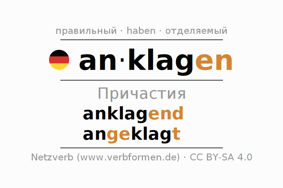 Спряжение anklagen в Партицип Презенс Перфект часть речи Действительный залог (актив): anklagend, angeklagt.Образование этих форм происходит по определённым грамматическим правилам. Так же спрягаются простые глагольные формы anklagen в Партицип. Kомментарии ☆