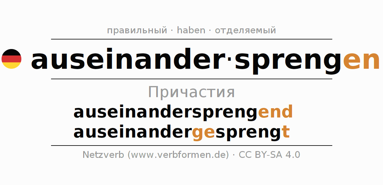 Этот глагол auseinandersprengen (hat) полностью спрягается во всех лицах и числах Партицип Презенс Перфект.