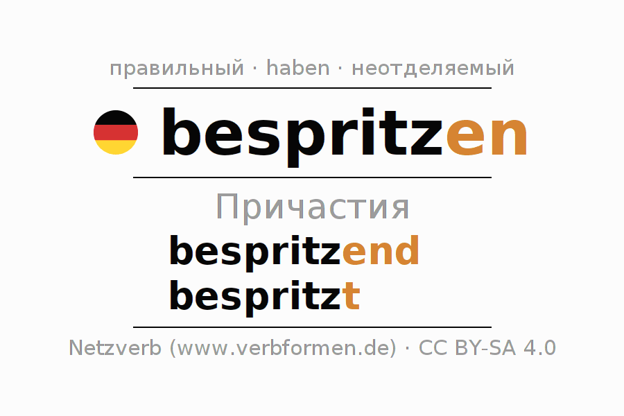 Этот глагол bespritzen полностью спрягается во всех лицах и числах Партицип Презенс Перфект.