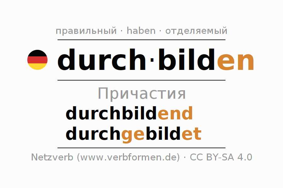 Спряжение durchbilden в Партицип Презенс Перфект часть речи Действительный залог (актив): durchbildend, durchgebildet.Образование этих форм происходит по определённым грамматическим правилам. Так же спрягаются простые глагольные формы durchbilden в Партицип. Kомментарии ☆