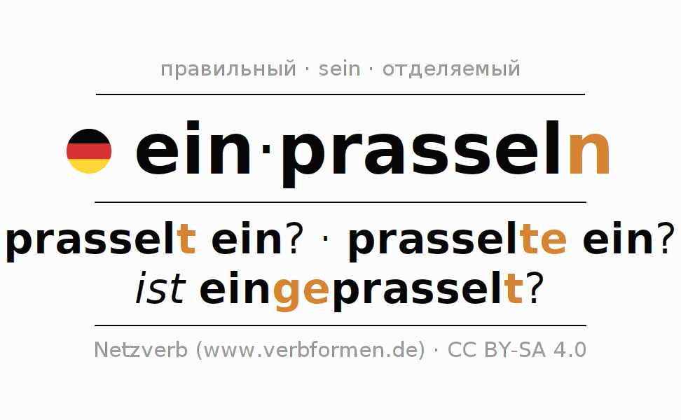 Этот глагол einprasseln полностью спрягается во всех лицах и числах Партицип Презенс Перфект.
