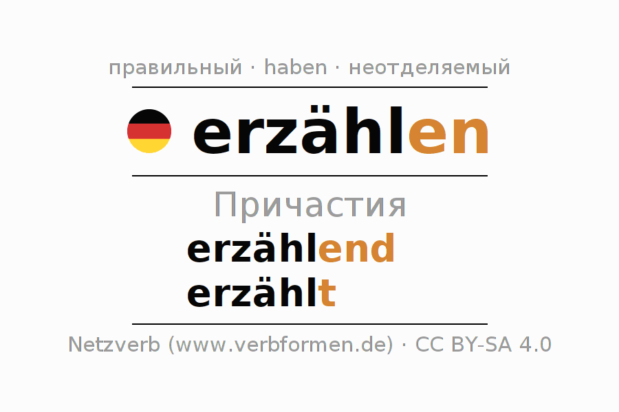 Спряжение erzählen в Партицип Презенс Перфект часть речи Действительный залог (актив): erzählend, erzählt.Образование этих форм происходит по определённым грамматическим правилам. Так же спрягаются простые глагольные формы erzählen в Партицип. Kомментарии ☆