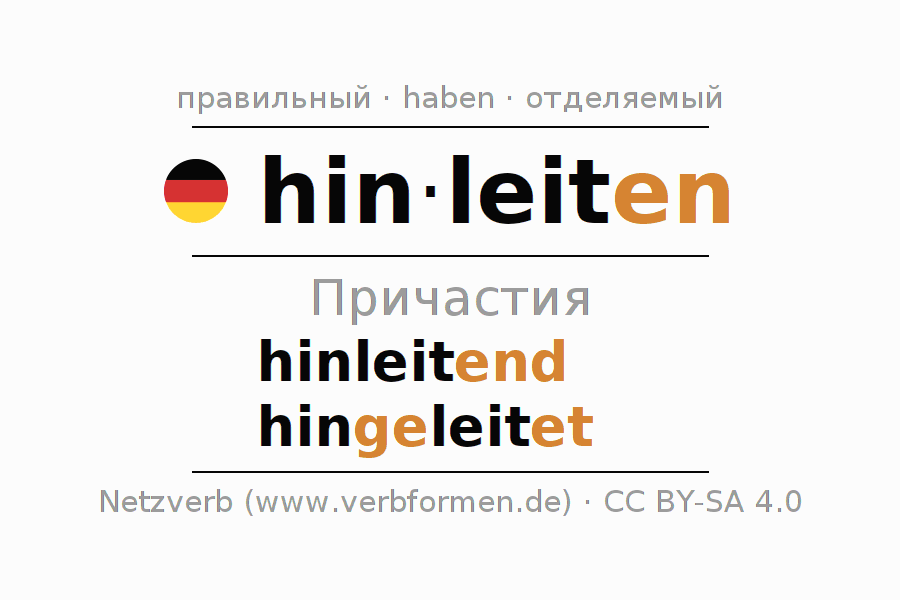 Спряжение hinleiten в Партицип Презенс Перфект часть речи Действительный залог (актив): hinleitend, hingeleitet.Образование этих форм происходит по определённым грамматическим правилам. Так же спрягаются простые глагольные формы hinleiten в Партицип. Kомментарии ☆