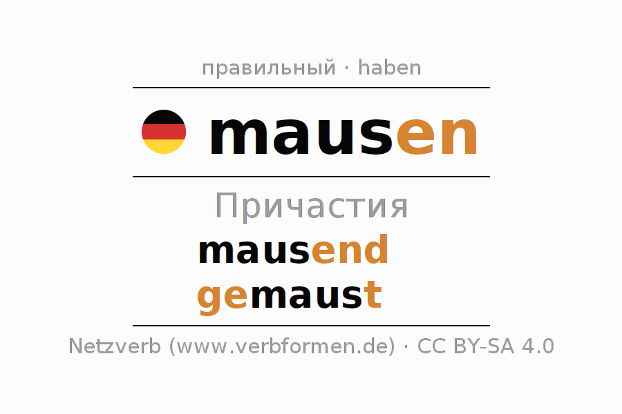 Спряжение mausen в Партицип Презенс Перфект часть речи Действительный залог (актив): mausend, gemaust.Образование этих форм происходит по определённым грамматическим правилам. Так же спрягаются простые глагольные формы mausen в Партицип. Kомментарии ☆