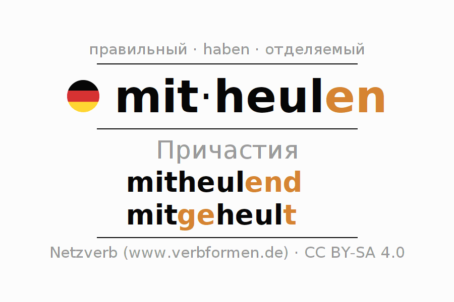 Спряжение mitheulen в Партицип Презенс Перфект часть речи Действительный залог (актив): mitheulend, mitgeheult.Образование этих форм происходит по определённым грамматическим правилам. Так же спрягаются простые глагольные формы mitheulen в Партицип. Kомментарии ☆