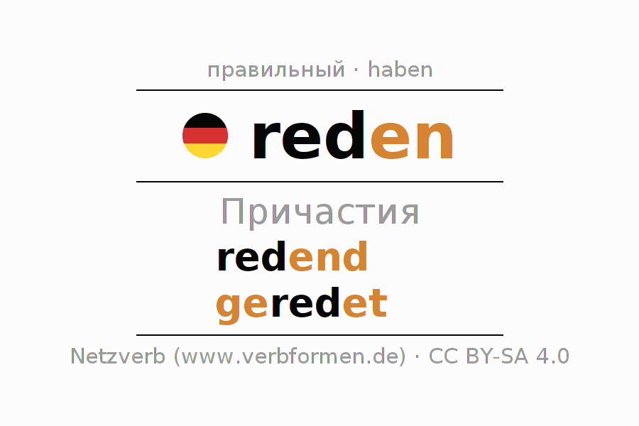 Спряжение reden в Партицип Презенс Перфект часть речи Действительный залог (актив): redend, geredet.Образование этих форм происходит по определённым грамматическим правилам. Так же спрягаются простые глагольные формы reden в Партицип. Kомментарии ☆