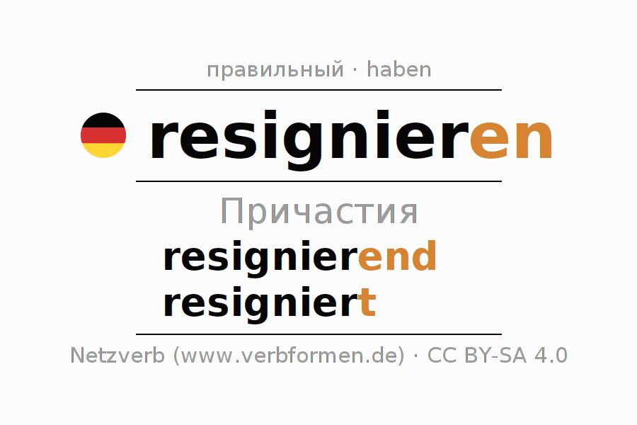 Этот глагол resignieren полностью спрягается во всех лицах и числах Партицип Презенс Перфект.
