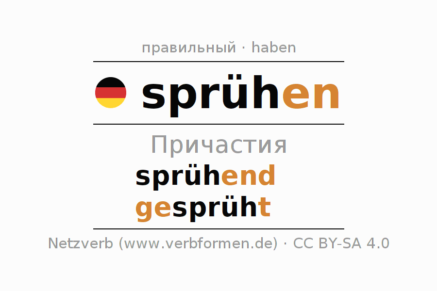 Спряжение sprühen в Партицип Презенс Перфект часть речи Действительный залог (актив): sprühend, gesprüht.Образование этих форм происходит по определённым грамматическим правилам. Так же спрягаются простые глагольные формы sprühen в Партицип. Kомментарии ☆