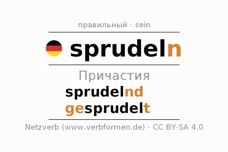 Спряжение sprudeln в Партицип Презенс Перфект часть речи Действительный залог (актив): sprudelnd, gesprudelt.Образование этих форм происходит по определённым грамматическим правилам. Так же спрягаются простые глагольные формы sprudeln в Партицип. Kомментарии ☆