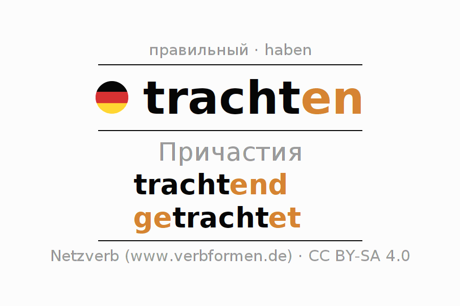 Спряжение trachten в Партицип Презенс Перфект часть речи Действительный залог (актив): trachtend, getrachtet.Образование этих форм происходит по определённым грамматическим правилам. Так же спрягаются простые глагольные формы trachten в Партицип. Kомментарии ☆
