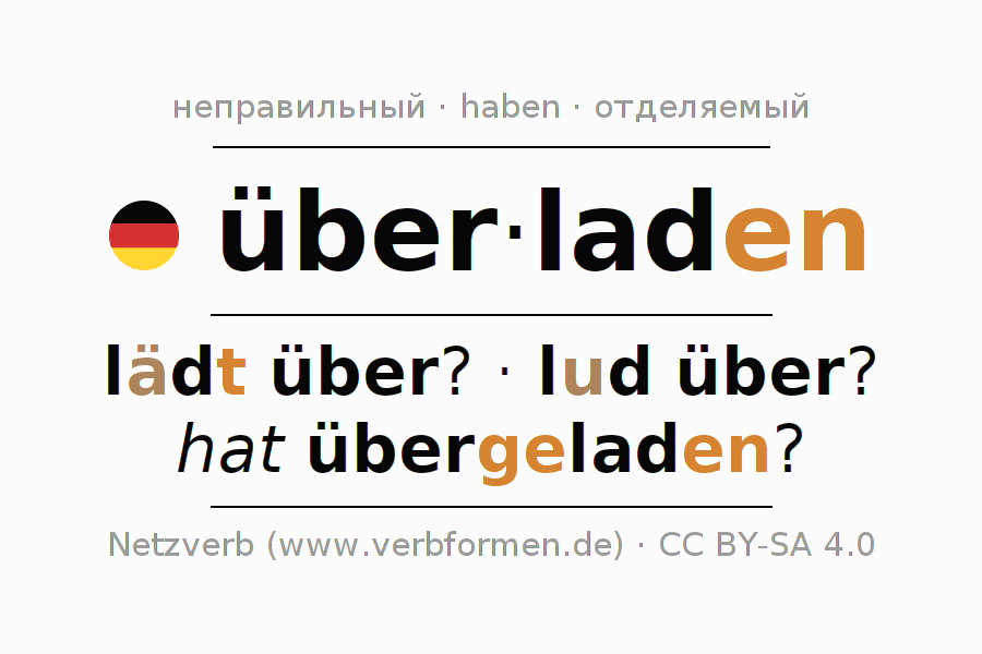 Спряжение überladen в Партицип Презенс Перфект часть речи Действительный залог (актив): überladend, übergeladen.Образование этих форм происходит по определённым грамматическим правилам. Так же спрягаются простые глагольные формы überladen в Партицип. Kомментарии ☆