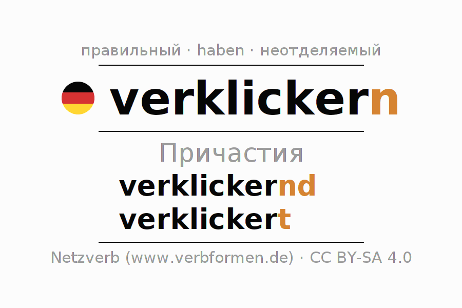 Спряжение verklickern в Партицип Презенс Перфект часть речи Действительный залог (актив): verklickernd, verklickert.Образование этих форм происходит по определённым грамматическим правилам. Так же спрягаются простые глагольные формы verklickern в Партицип. Kомментарии ☆