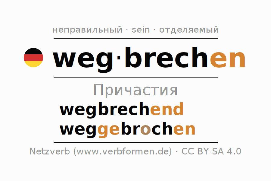 Спряжение wegbrechen в Партицип Презенс Перфект часть речи Действительный залог (актив): wegbrechend, weggebrochen.Образование этих форм происходит по определённым грамматическим правилам. Так же спрягаются простые глагольные формы wegbrechen в Партицип. Kомментарии ☆