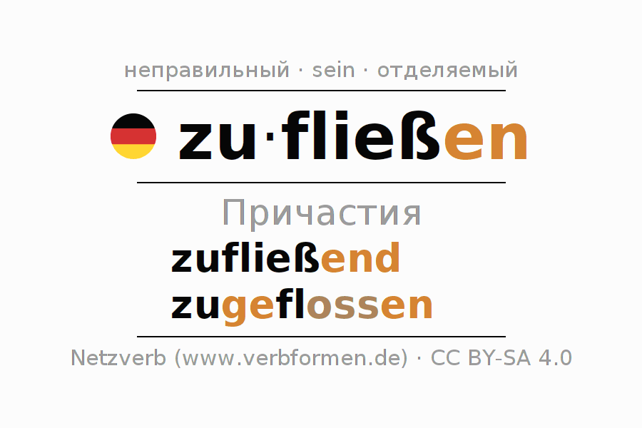 Спряжение zufließen в Партицип Презенс Перфект часть речи Действительный залог (актив): zufließend, zugeflossen.Образование этих форм происходит по определённым грамматическим правилам. Так же спрягаются простые глагольные формы zufließen в Партицип. Kомментарии ☆