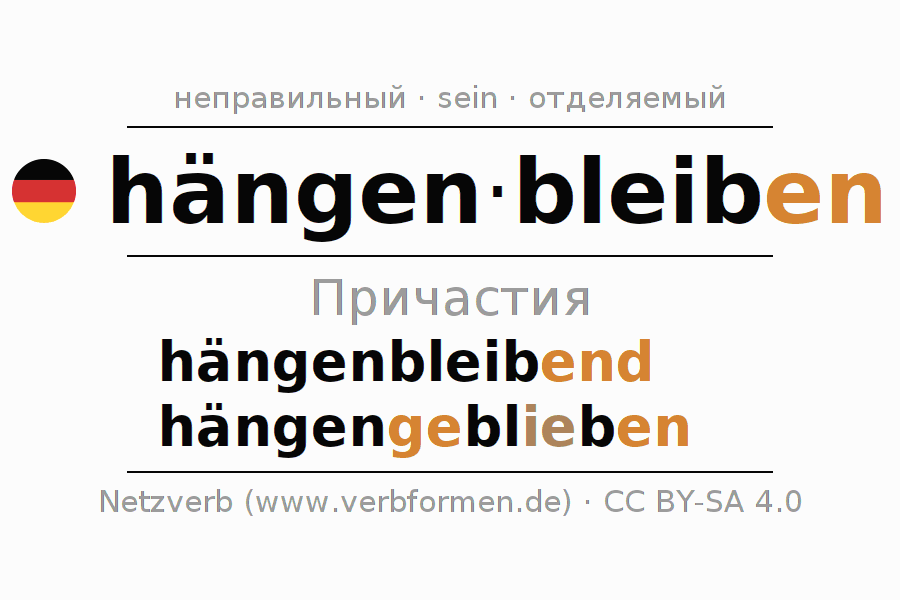 Формами причастия hängenbleiben (застрять, виновным) являются: {PARTIZIP 1}, {PARTIZIP 2}