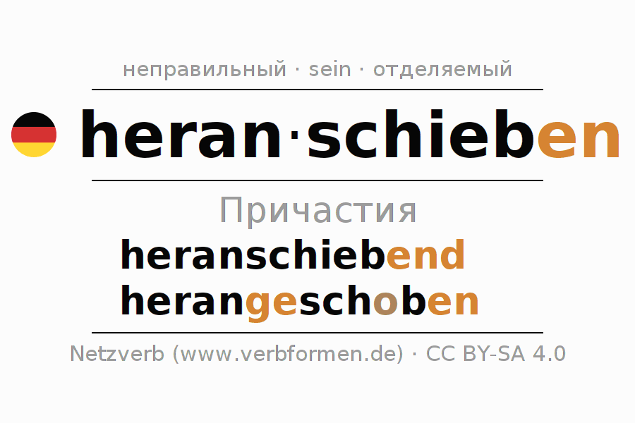 Формами причастия heranschieben (пододвинуть) являются: {PARTIZIP 1}, {PARTIZIP 2}