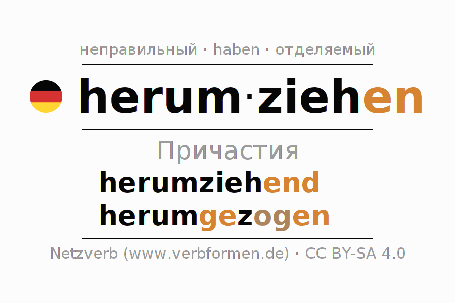 Формами причастия herumziehen (обходить, окружать) являются: {PARTIZIP 1}, {PARTIZIP 2}