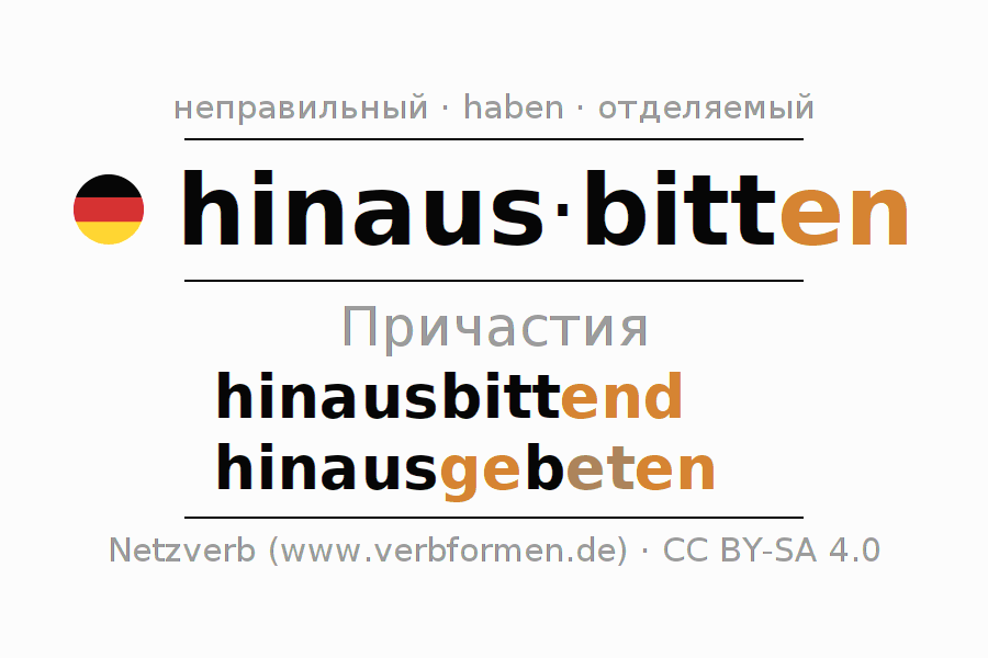 Формами причастия hinausbitten (пригласить выйти) являются: {PARTIZIP 1}, {PARTIZIP 2}