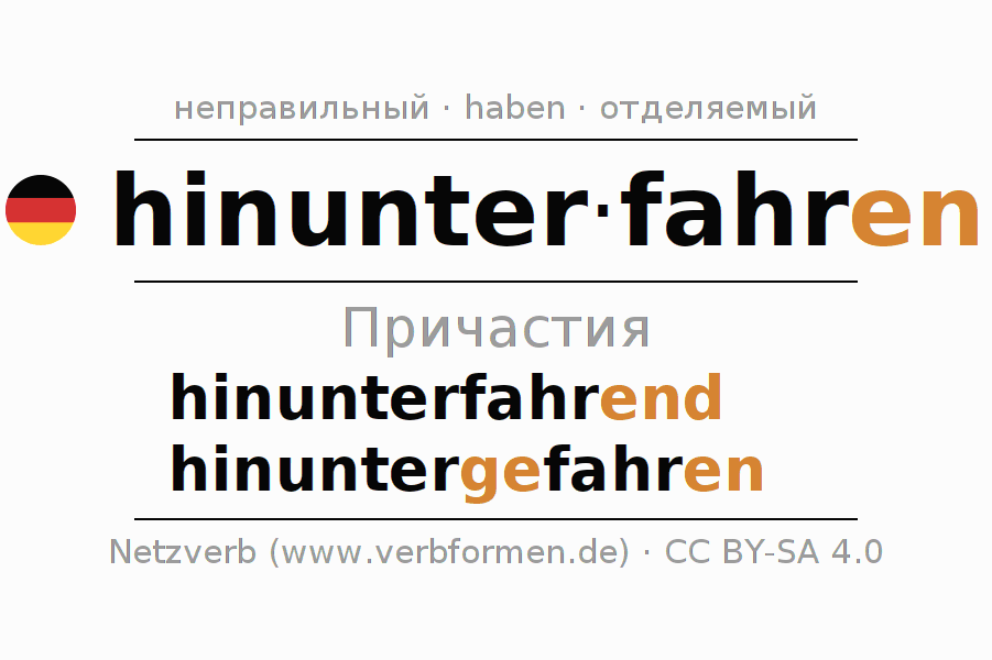 Формами причастия hinunterfahren (спускаться) являются: {PARTIZIP 1}, {PARTIZIP 2}