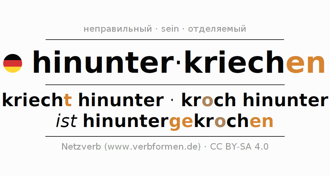 Формами причастия hinunterkriechen (сползать, ползти вниз) являются: {PARTIZIP 1}, {PARTIZIP 2}