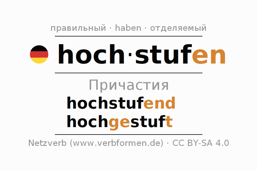 Формами причастия hochstufen (повышать) являются: {PARTIZIP 1}, {PARTIZIP 2}