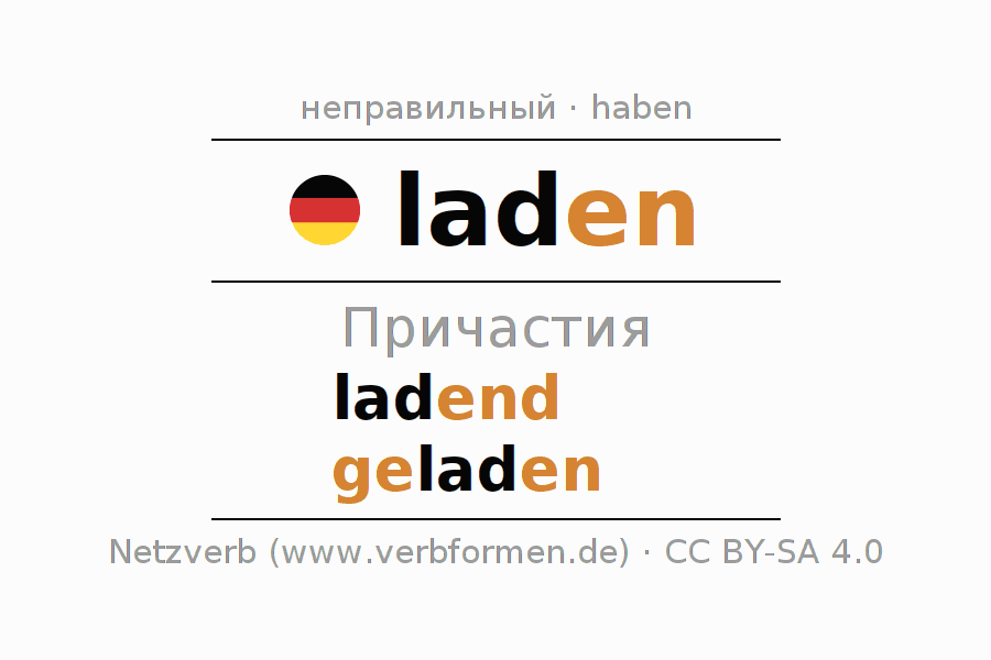 Формами причастия laden (загружать, заряжать) являются: {PARTIZIP 1}, {PARTIZIP 2}