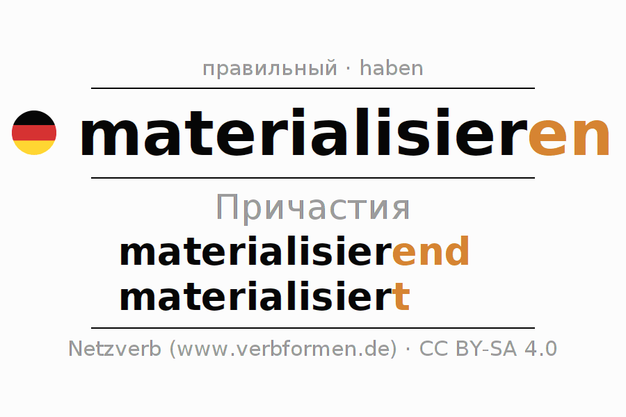 Формами причастия materialisieren (материализовать, воплотить) являются: {PARTIZIP 1}, {PARTIZIP 2}