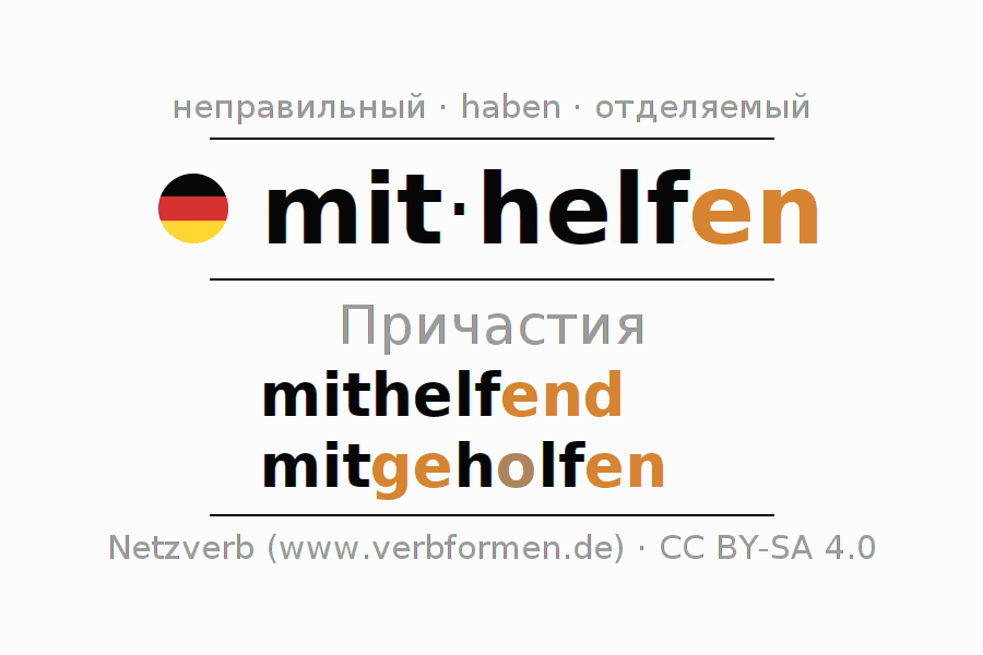 Формами причастия mithelfen (помогать, помочь) являются: {PARTIZIP 1}, {PARTIZIP 2}