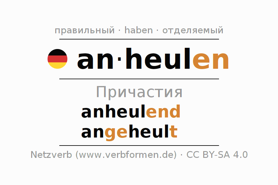 Спряжение anheulen в Партицип Презенс Перфект часть речи Действительный залог (актив): anheulend, angeheult.Образование этих форм происходит по определённым грамматическим правилам. Так же спрягаются простые глагольные формы anheulen в Партицип. Kомментарии ☆